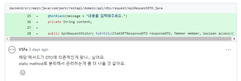content, methodType는 ApiRequestDTO에 있는 필드의 값을 그대로 사용한다. 즉 어차피 dto의 값이 필요한 건 동일하기 때문에 나는 해당 로직은 유지하기로 결정했다. 물론 static으로 바꾸면 재사용성이나 SRP를 지킬 수 있다는 장점이 있지만 이 로직을 재사용할 곳이 없다고 판단했다.